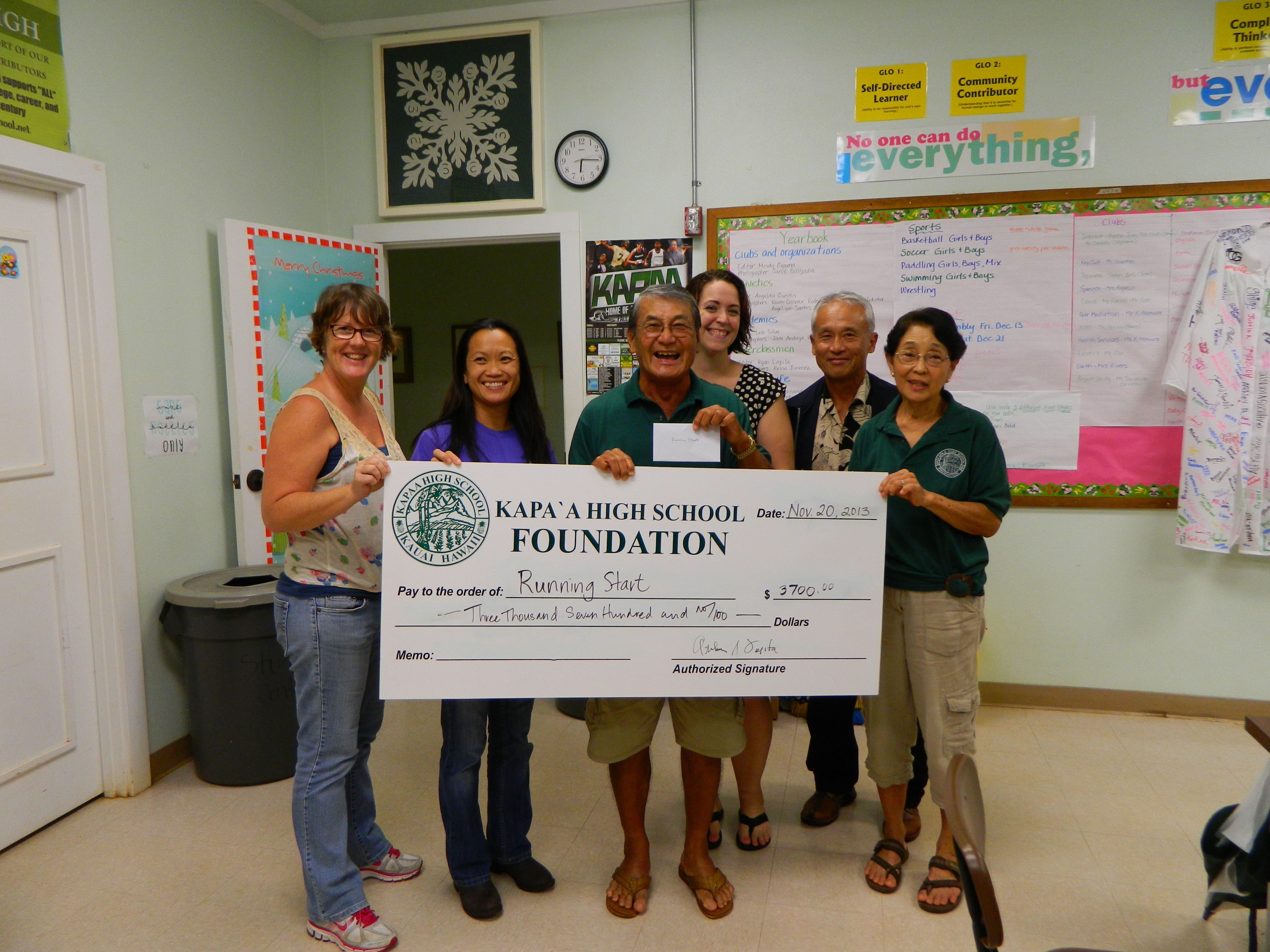 Running Start- Math 103 is a new program at Kapaa High campus that will allow students to get college credits for by signing up for this math class. Instructors Ms. Fawn Perry, Ms. Kathryn Baily, and  Ms.  Gigi Drent, assitant math professor at Kauai Community College, were present to accept $3700 from the Foundation to help subsidize the tuition for this college class. The students must get a passing grade of  C or better  to get reimbursed for the expense.