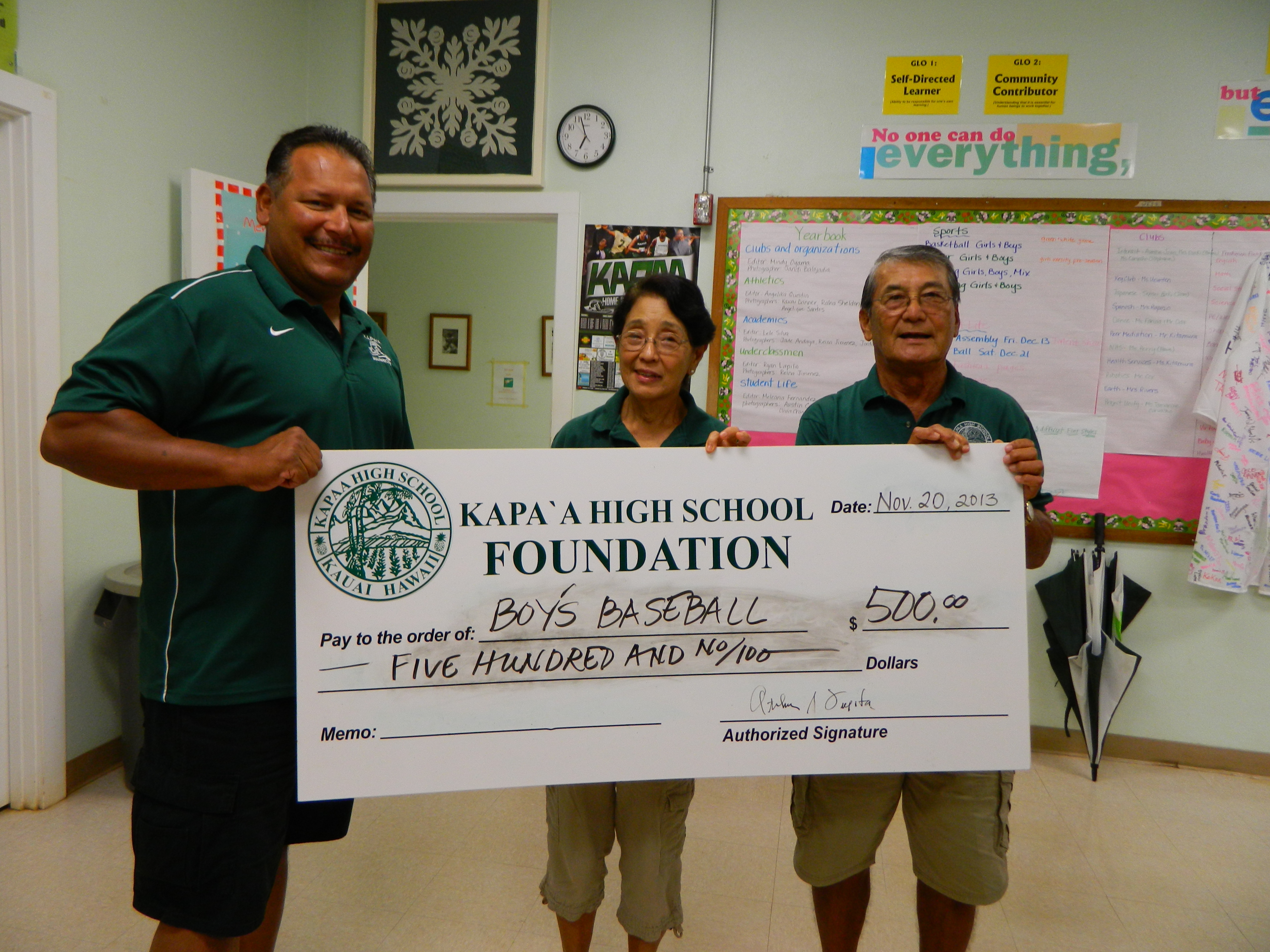 Athleltic Director Greg Gonsalves accepts check for $500 for Boys Baseball team from Board members Shellie Domingsel, President Art Fujita and Daniel Hamada