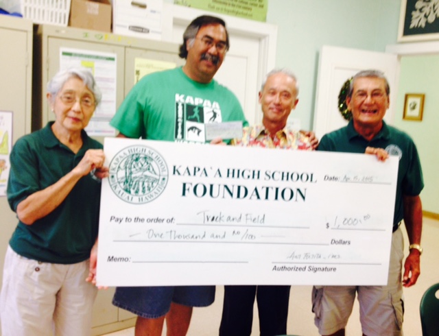The Track and Field program at Kapaa High School was given a grant of $1000 to purchase new equipment for the new season. The money will be used to purchase batons, starting blocks, shot puts, discus, high jump cross bars, and other equipment that needed replacement. Coaches Ron Valesco and Rob Kubota attended the Board meeting to make their request and to thank the Foundation and donors for the support.